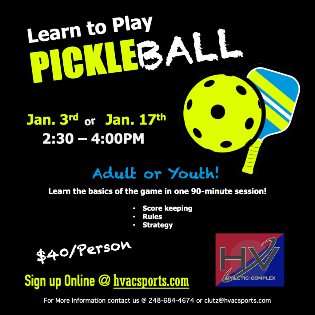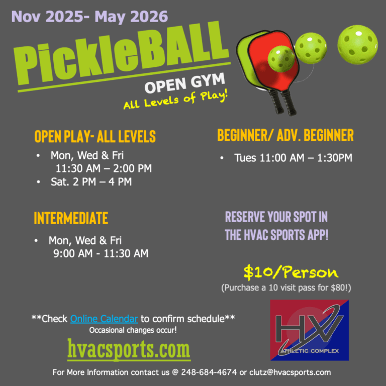 Day time Pickle Ball open gym sessions are available on a first come first serve basis. HVAC has 4 courts so we are limited to 24 players for a 2.5 hour session to make sure that everyone has a chance to play.
