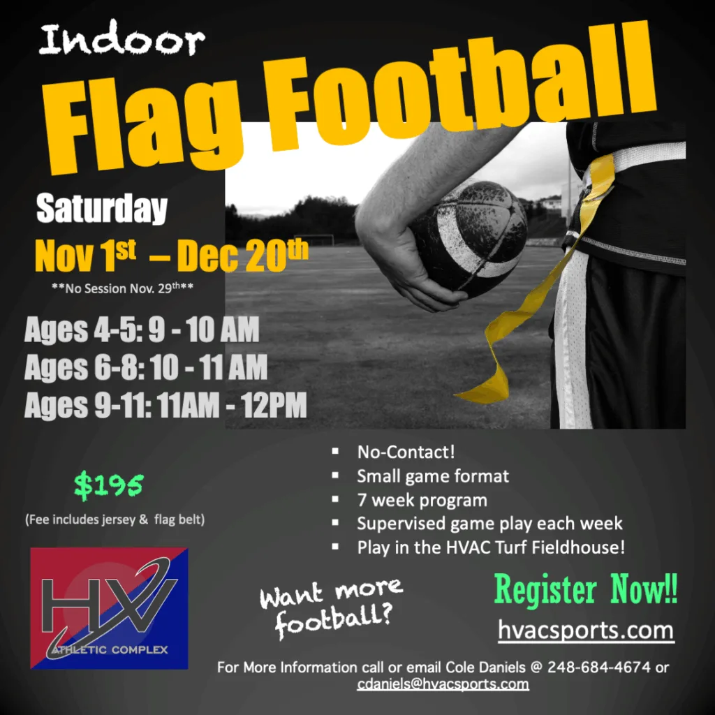 HVAC invites you to this exciting flag football recreational league for young players interested in learning the game and having fun while doing so! The league will take place at Hickory Ridge. We will strive to teach these young players the proper fundamentals of the game including catching, throwing, and offensive and defensive concepts.