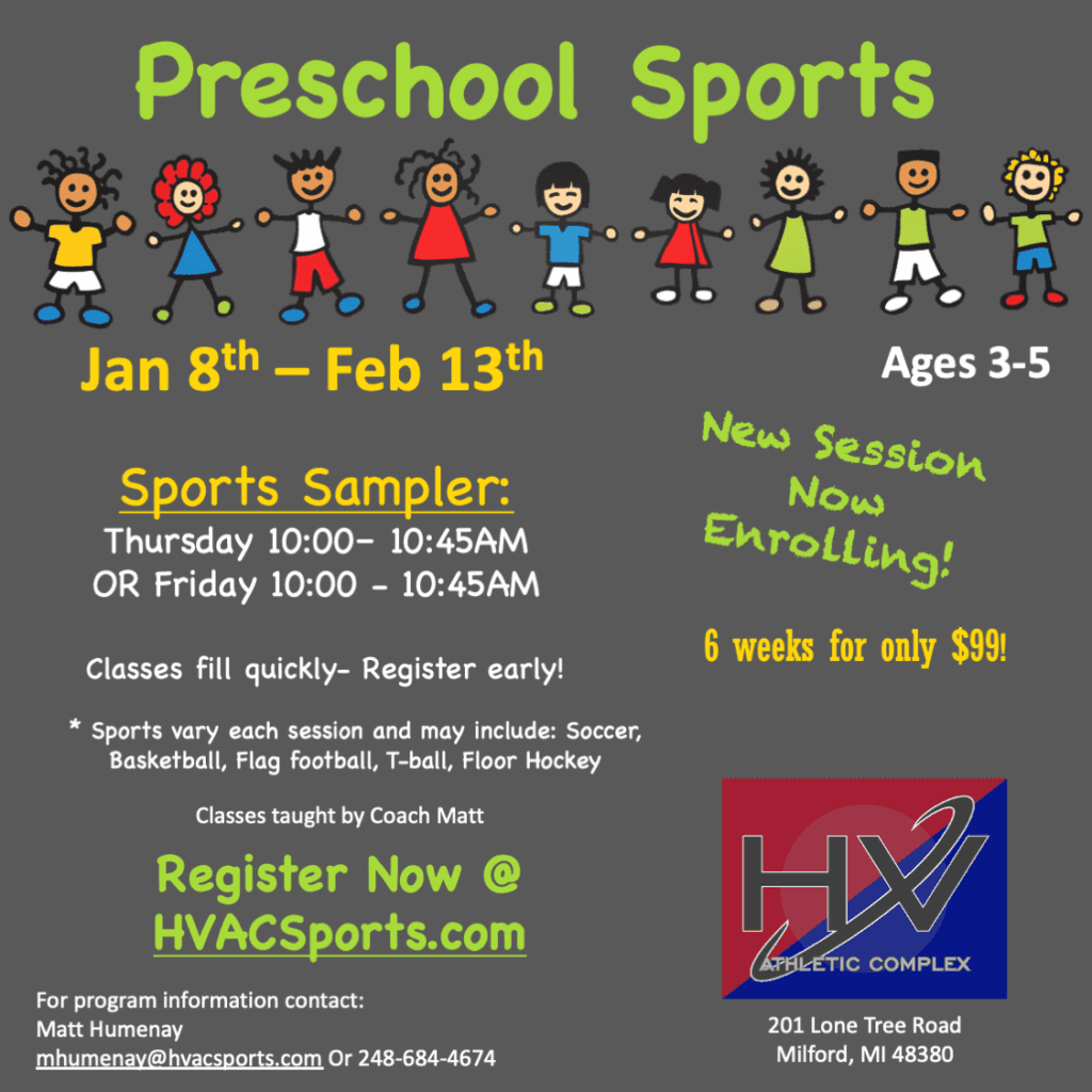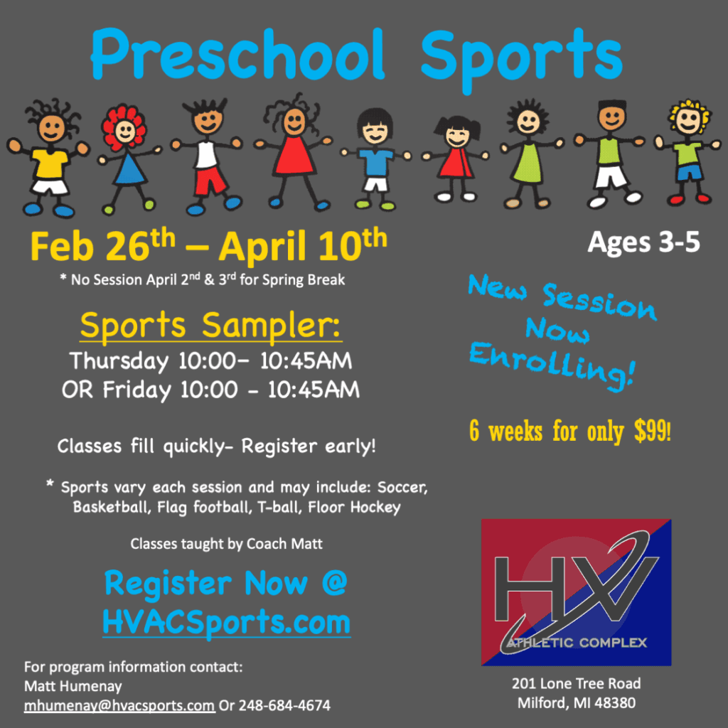 HVAC invites you to these exciting Sports programs for young players interested in learning multiple sports, and having fun while doing so! We will strive to teach these young players the proper fundamentals of the game. We will work fundamentals and skills the first half of each session, and play some games for the second half. We expect to have lots of fun, while teaching proper techniques that the kids will be able to build on for a lifetime!