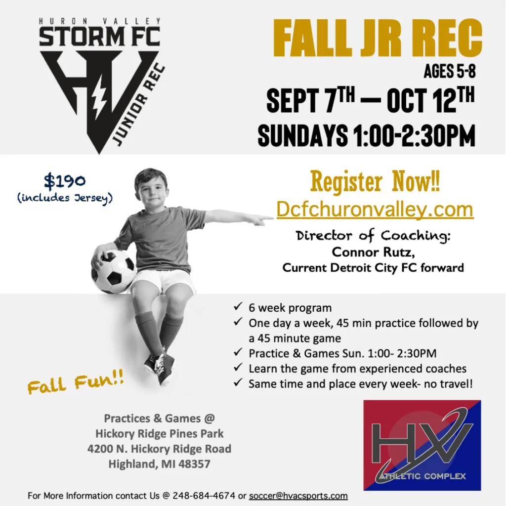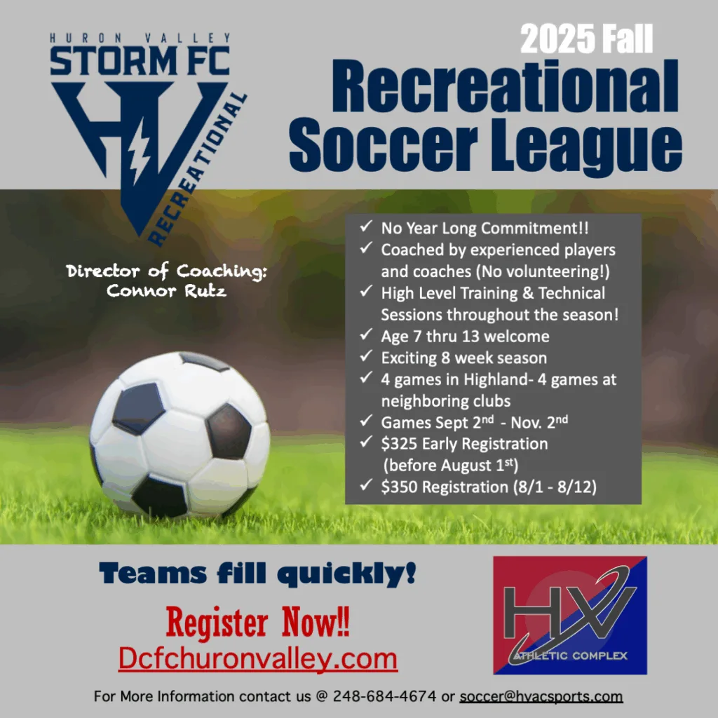 We are excited for our partnership with Huron Valley Athletic Complex! This partnership allows us a secure future of access to the best fields and facilities in the area and will ensure the growth and continuation of recreational soccer in our community!